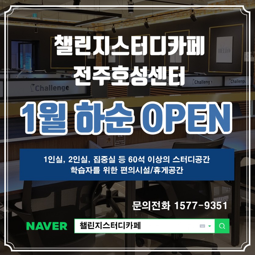 챌린지스터디카페 전주호성센터 오픈예정 페이지 정보 작성자 관리자 댓글 0건 조회 1,943회 작성일 20-12-11 16:48 목록 본문 챌린지스터디카페 전주호성센터가 신규오픈합니다.전북 전주시 덕진구 호성1길 33-10 (호성동 1가) 2층 전주호성센터는 1월 하순 오픈 예정으로1인실, 집중실, 일반실, 다인실, 휴게공간 등 다양한 스터디 공간이 마련되어집니다. 24시간/연중무휴/무인키오스크 운영사전 예약이벤트, 오픈이벤트를 진행할 예정이니 많은 참여 부탁 드립니다^^ [이 게시물은 관리자님에 의해 2020-12-15 12:31:00 공지사항에서 이동 됨] 이전글챌린지스터디카페 울산병영센터 오픈예정 20.12.11 다음글챌린지스터디카페 김해율하센터 오픈예정 20.12.11 댓글 0 댓글목록 등록된 댓글이 없습니다.